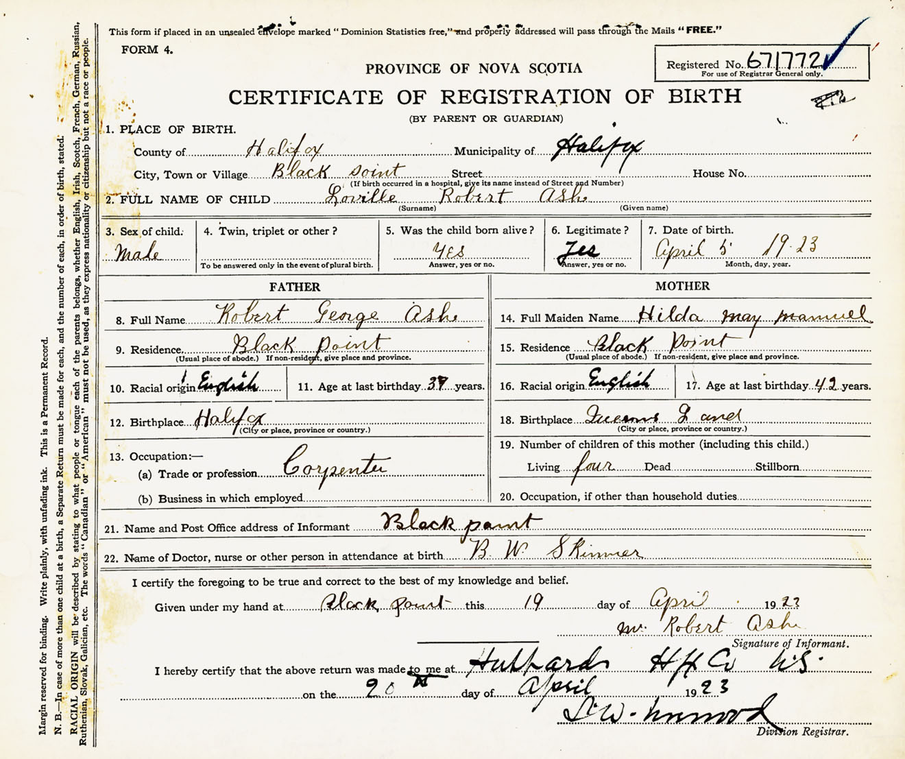 Male Birth Registration: Year: 1923 number: 67100772