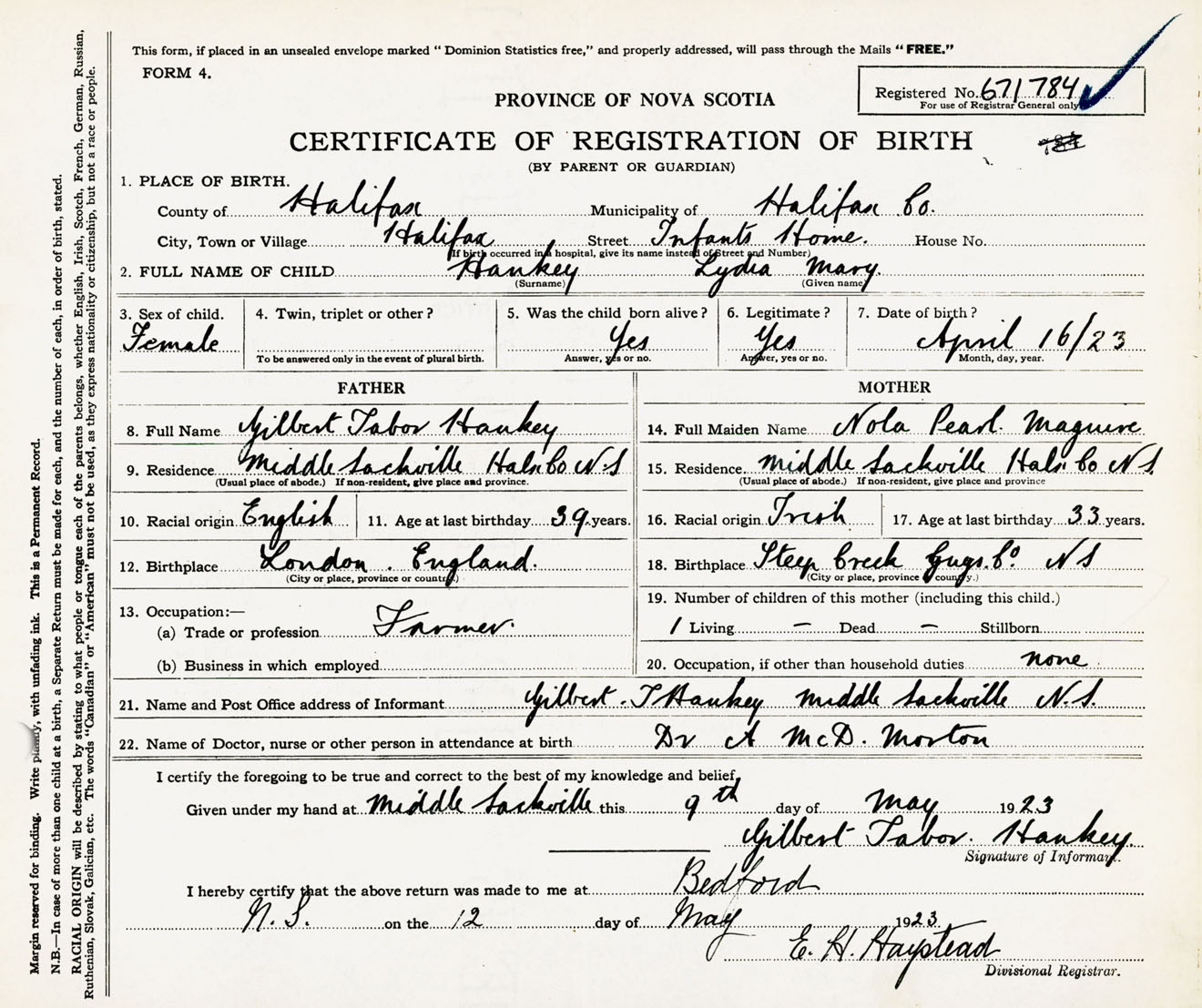 Female Birth Registration: Year: 1923 number: 67100784