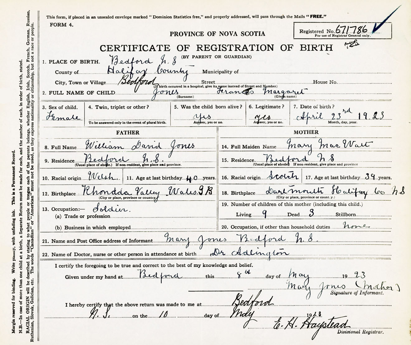 Female Birth Registration: Year: 1923 number: 67100786