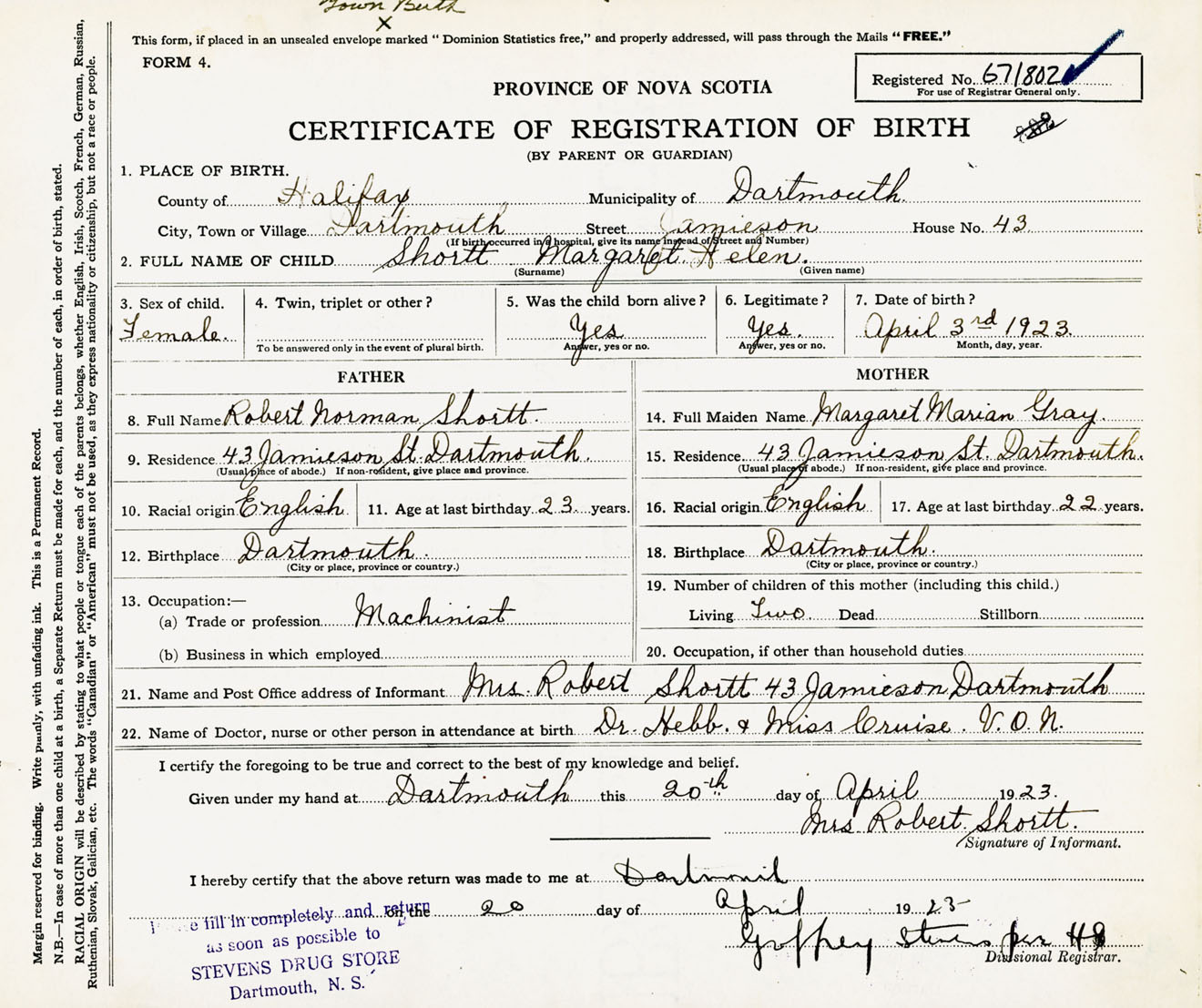 Female Birth Registration: Year: 1923 number: 67100802