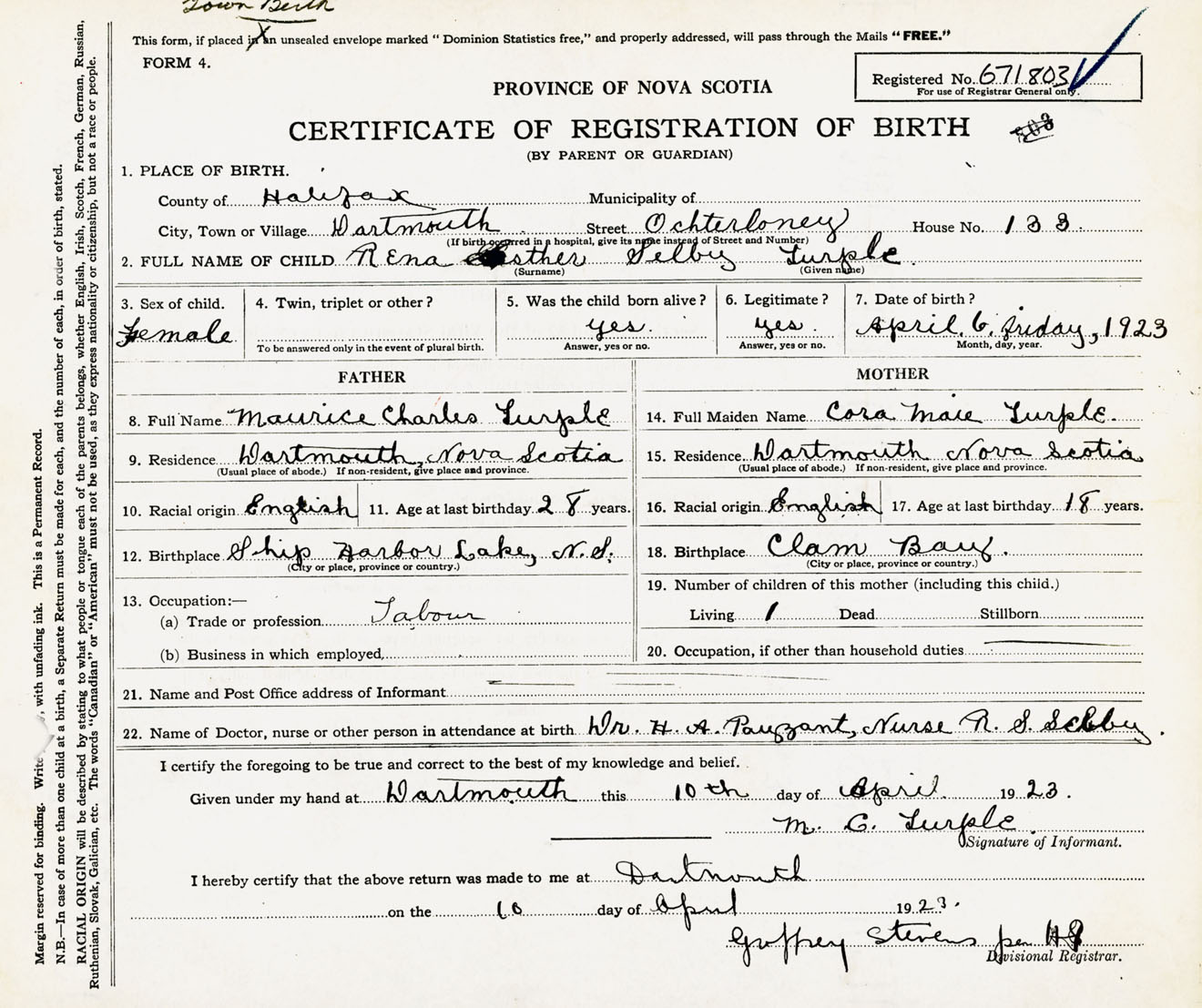 Female Birth Registration: Year: 1923 number: 67100803
