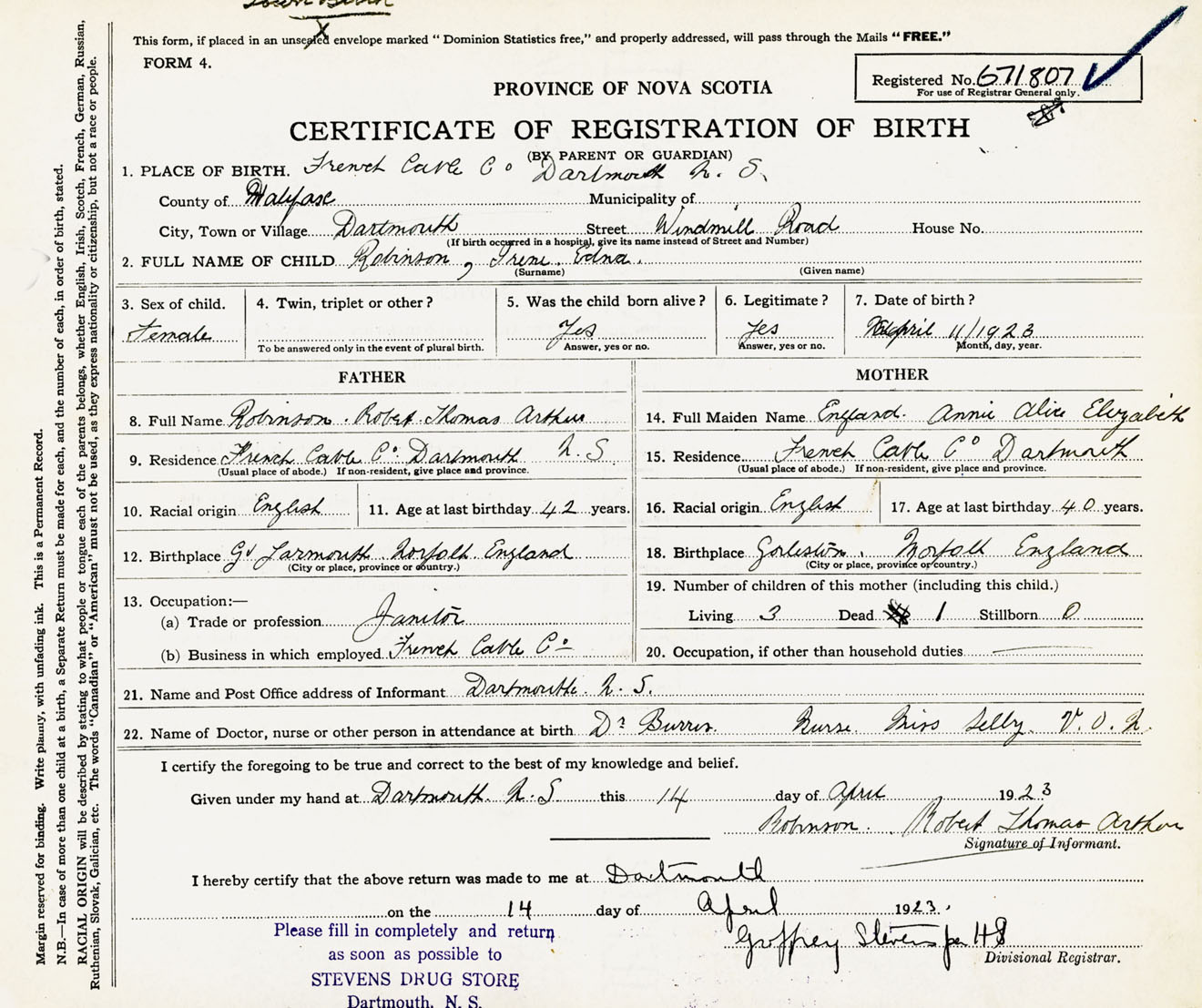 Female Birth Registration: Year: 1923 number: 67100807