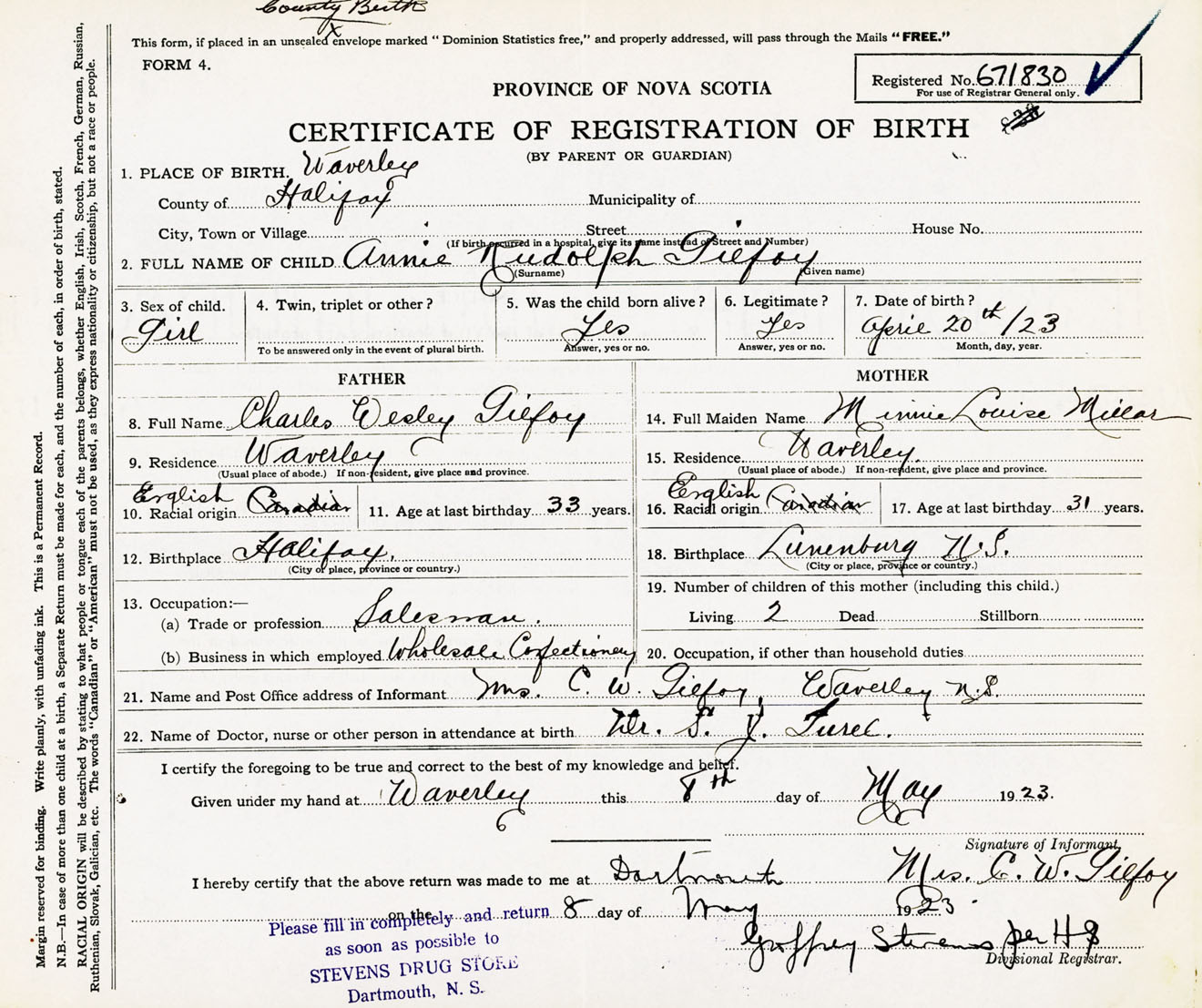 Female Birth Registration: Year: 1923 number: 67100830