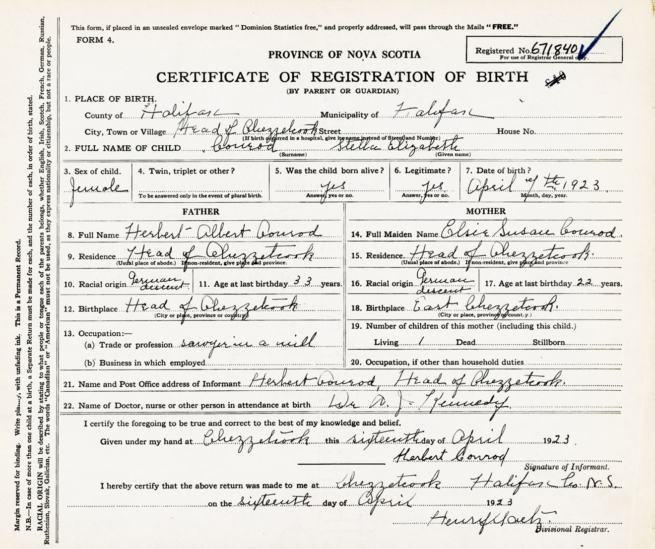 Female Birth Registration: Year: 1923 number: 67100840