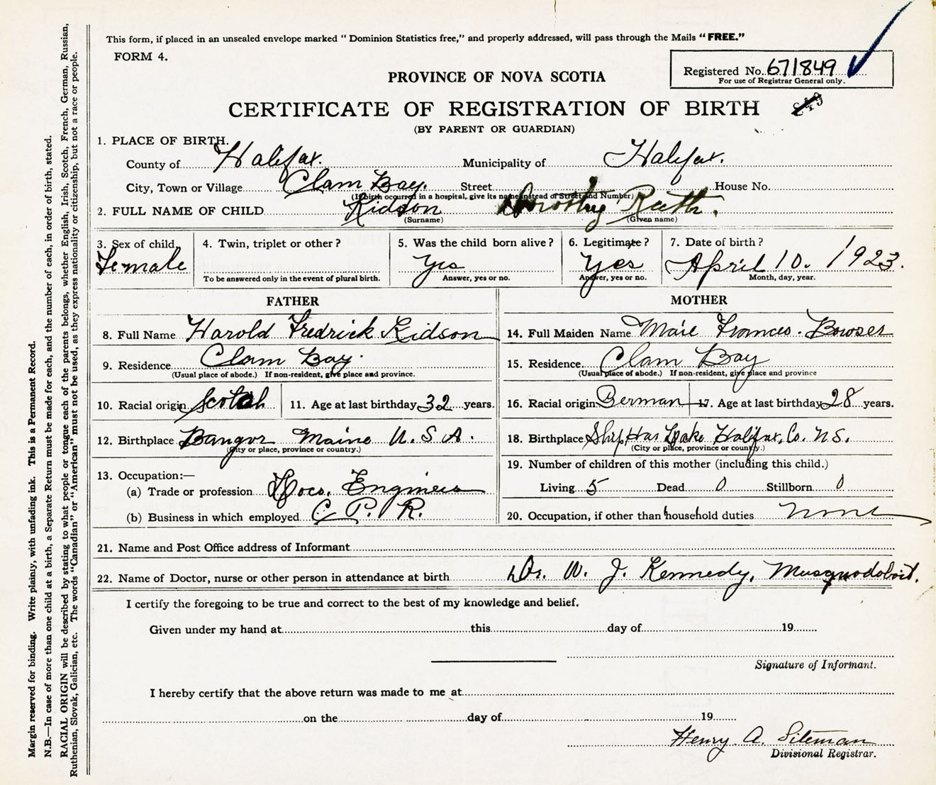 Female Birth Registration: Year: 1923 number: 67100849