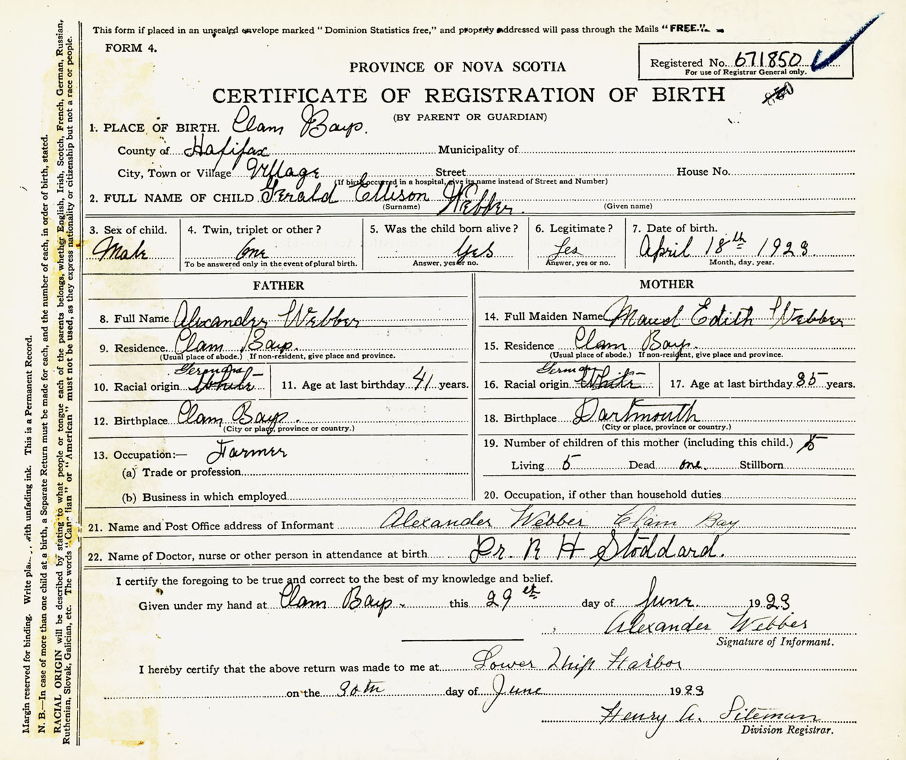 Male Birth Registration: Year: 1923 number: 67100850
