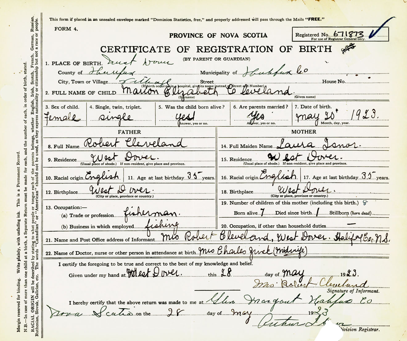 Female Birth Registration: Year: 1923 number: 67100873