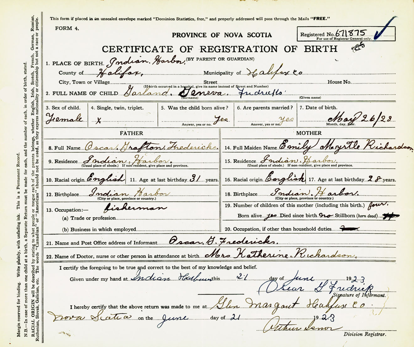 Female Birth Registration: Year: 1923 number: 67100875