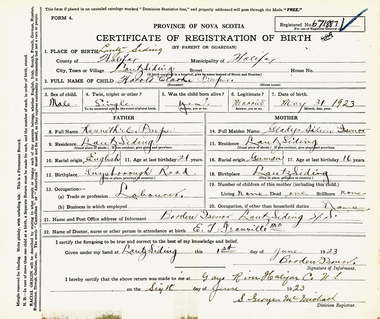 Male Birth Registration: Year: 1923 number: 67100887