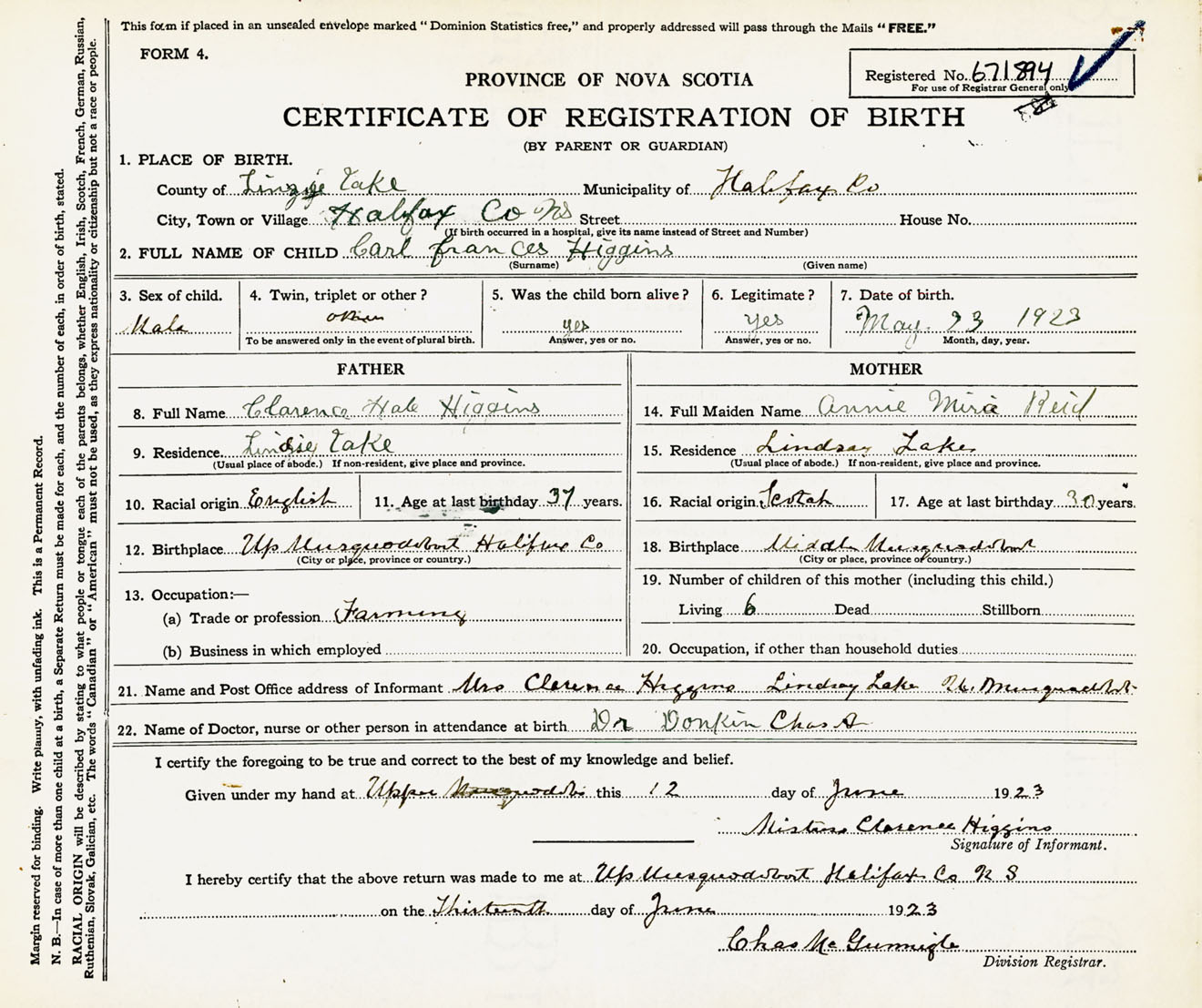 Male Birth Registration: Year: 1923 number: 67100894
