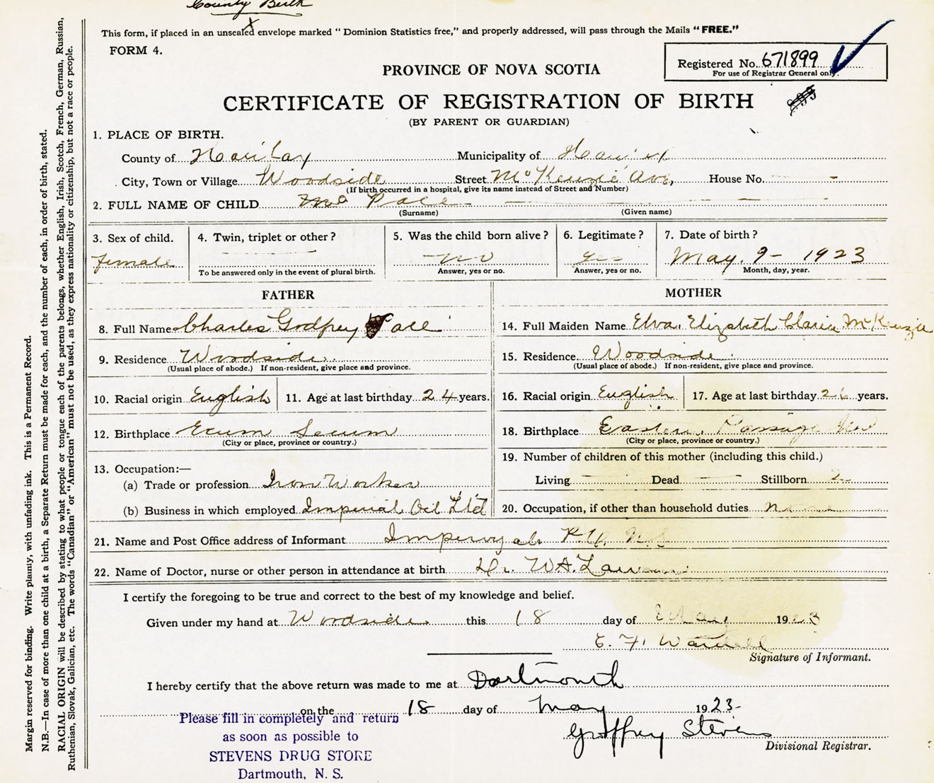 Female Birth Registration: Year: 1923 number: 67100899