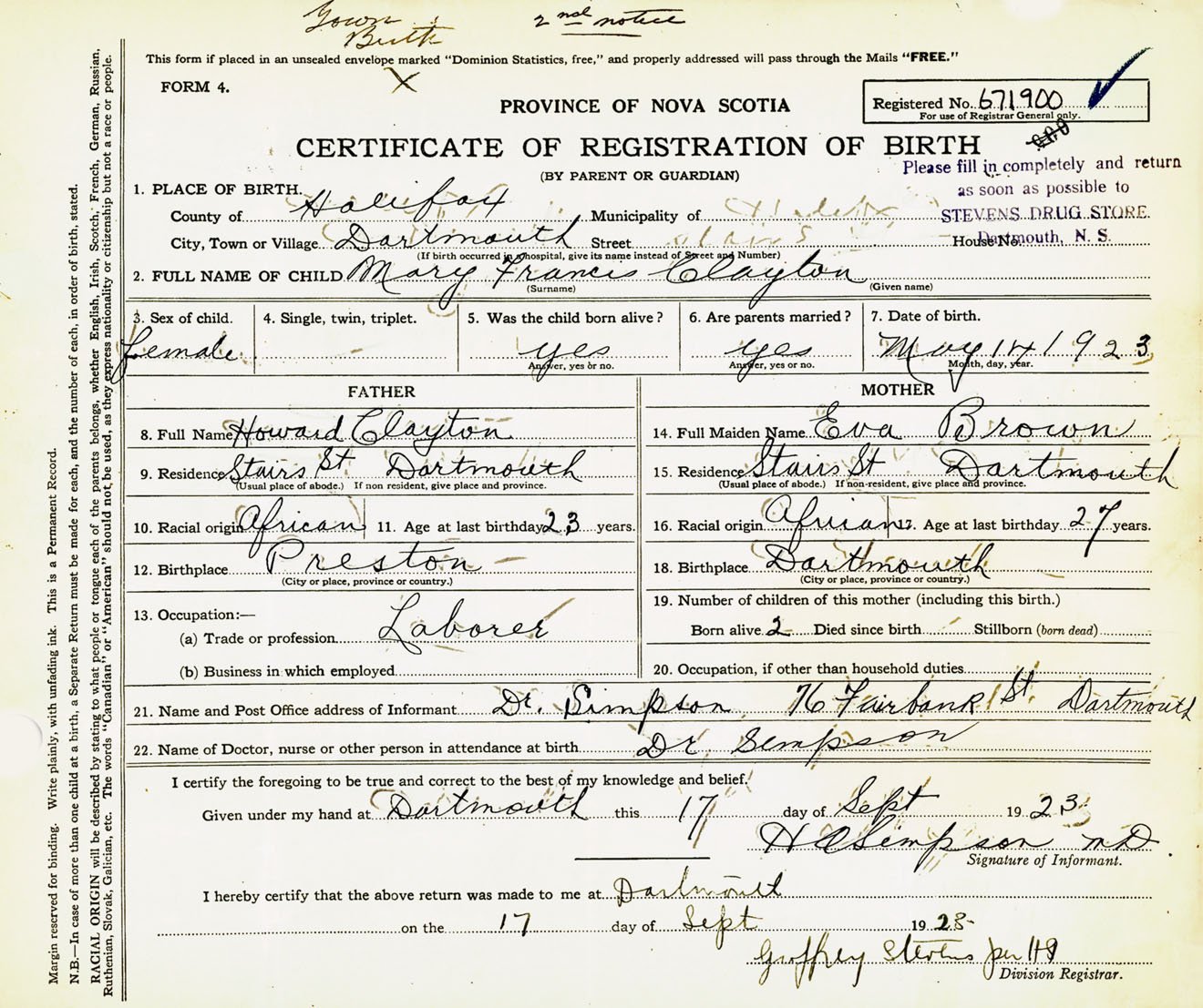 Female Birth Registration: Year: 1923 number: 67100900