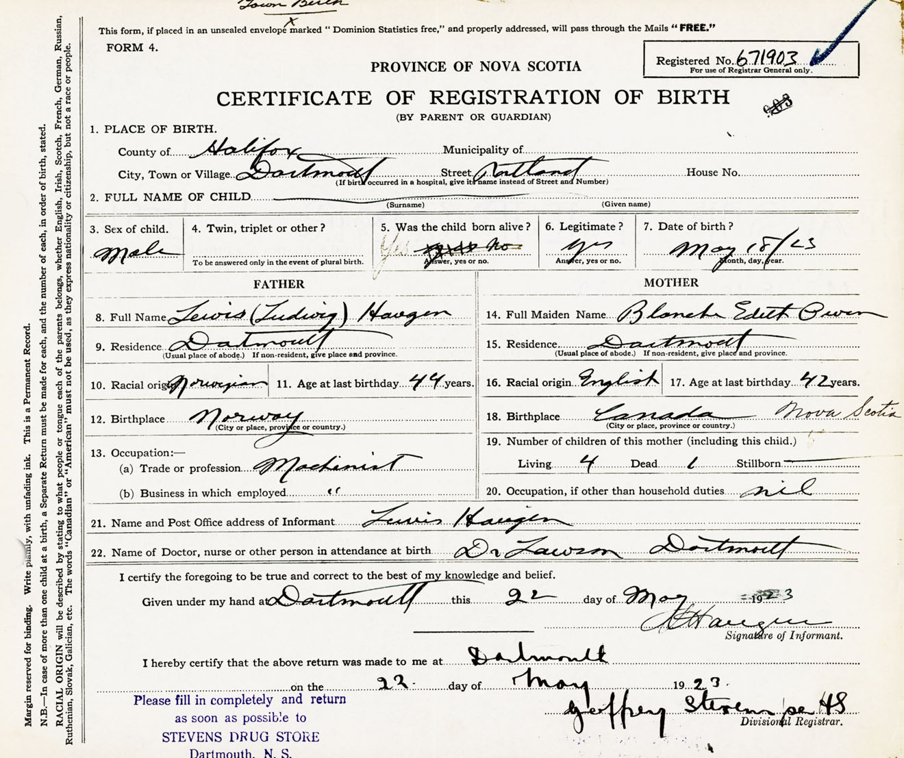 Male Birth Registration: Year: 1923 number: 67100903