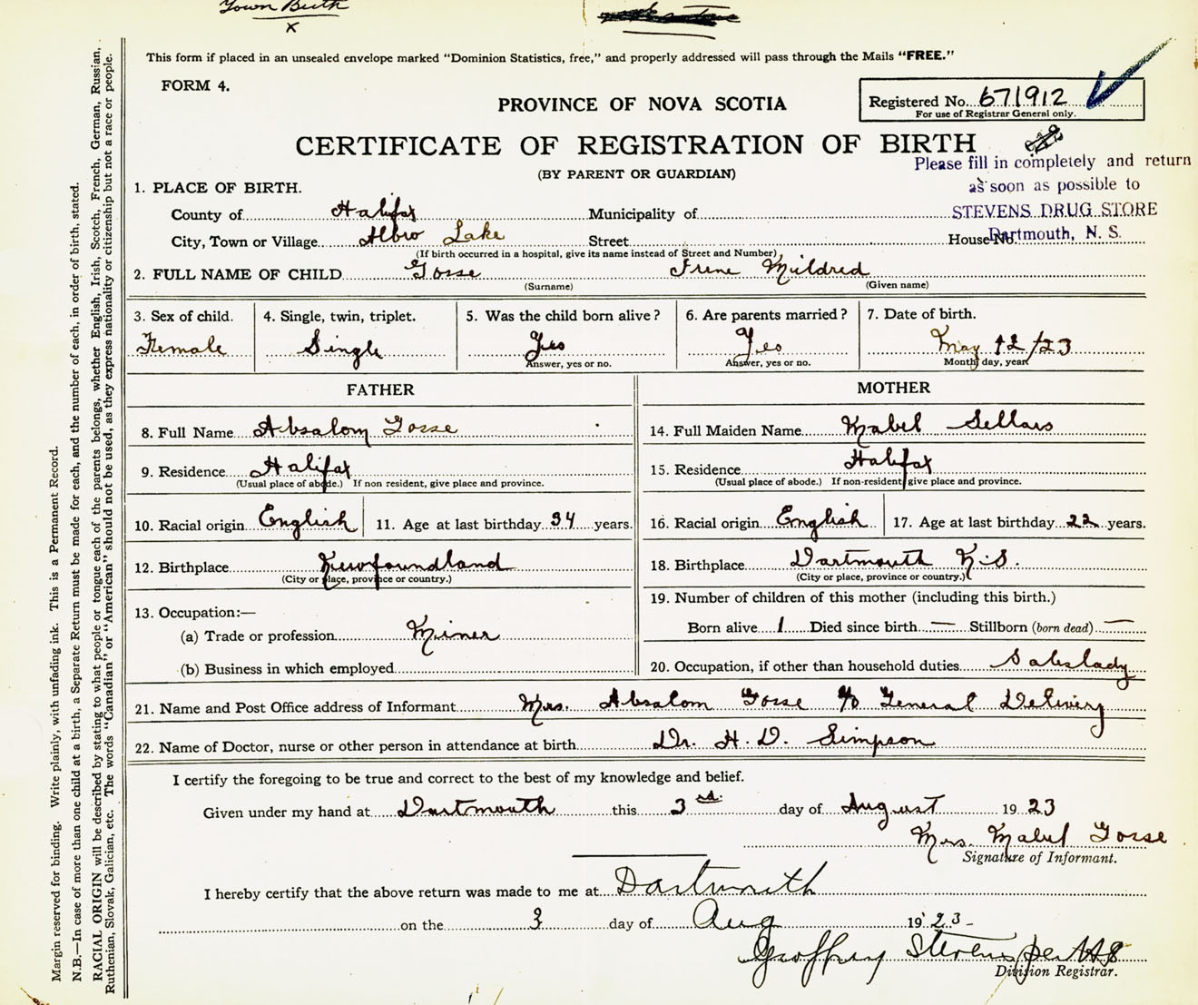 Female Birth Registration: Year: 1923 number: 67100912