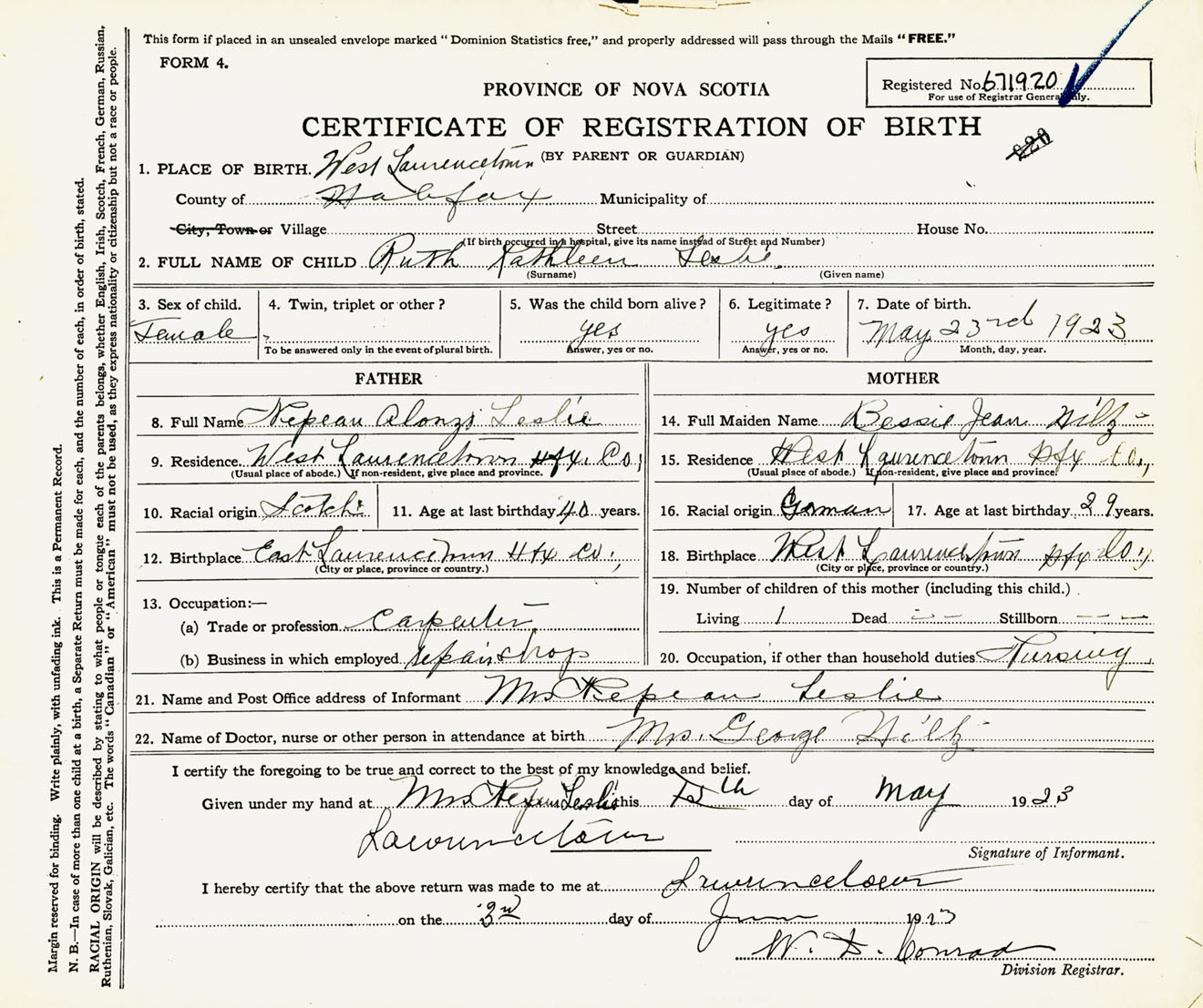 Female Birth Registration: Year: 1923 number: 67100920
