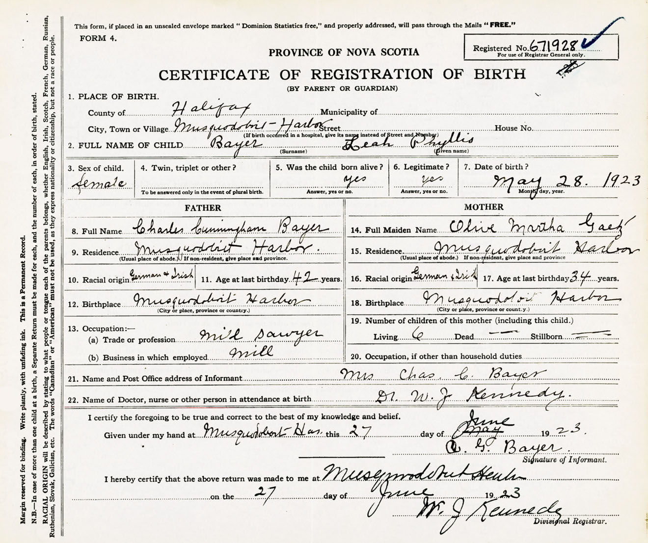 Female Birth Registration: Year: 1923 number: 67100928