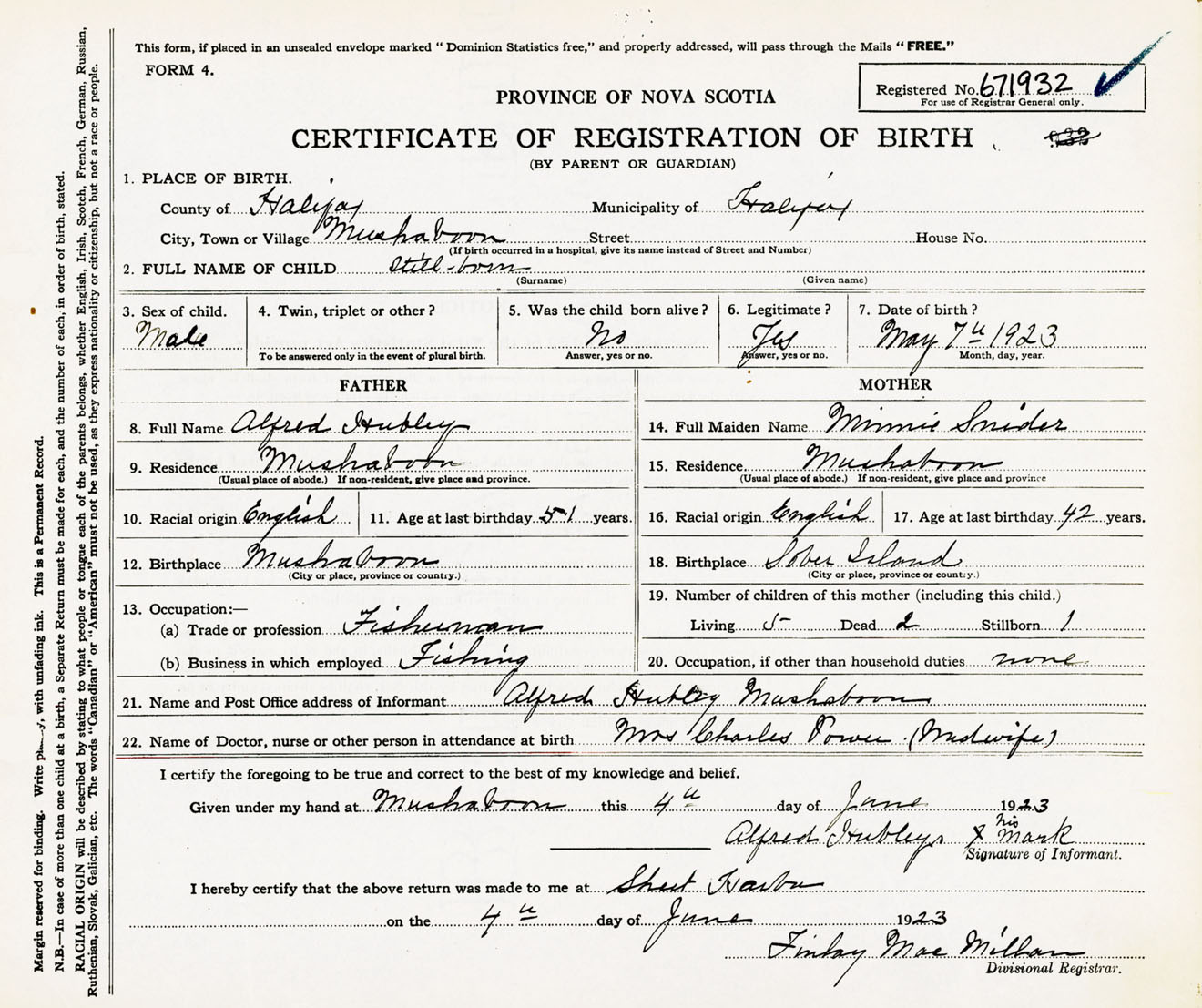 Male Birth Registration: Year: 1923 number: 67100932