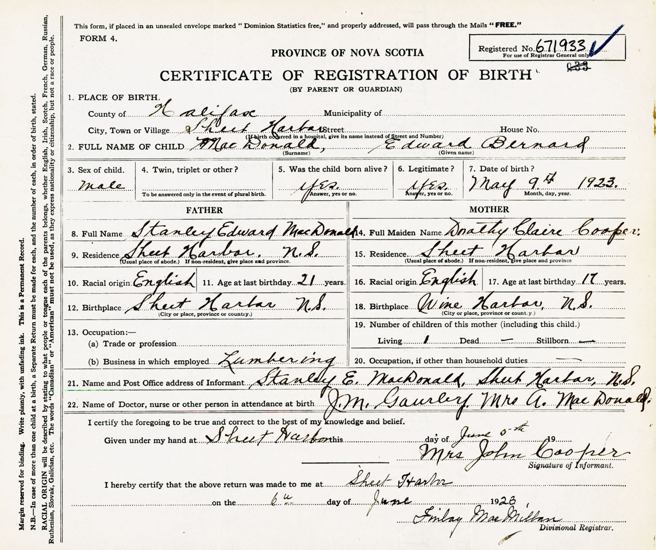 Male Birth Registration: Year: 1923 number: 67100933
