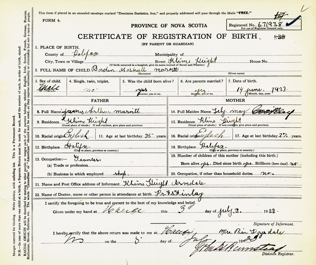Male Birth Registration: Year: 1923 number: 67100938