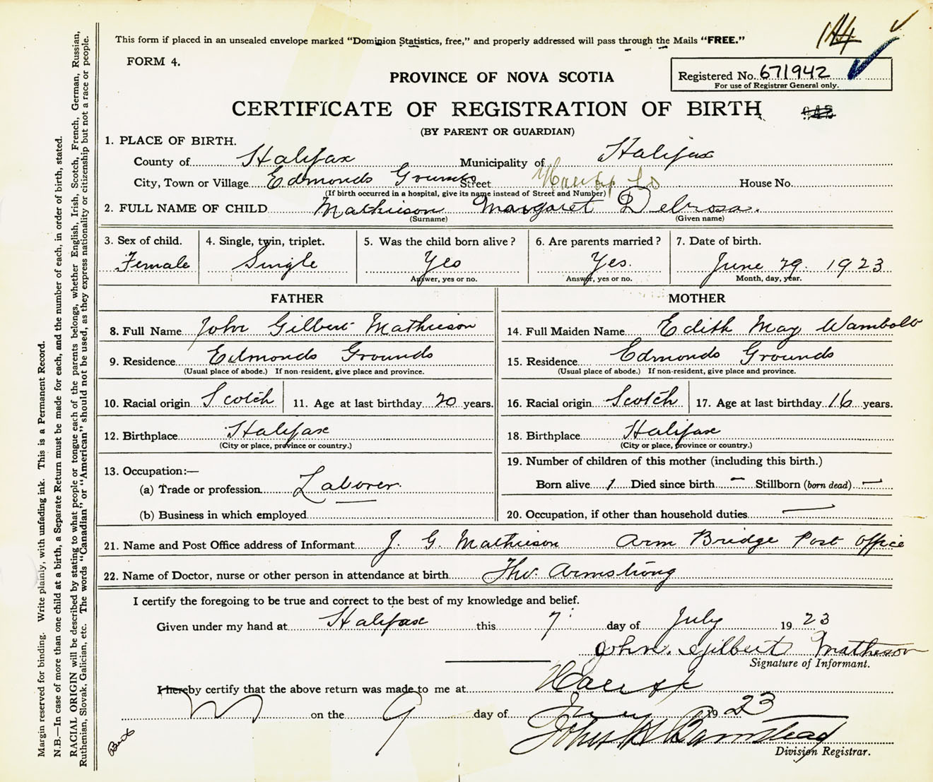 Female Birth Registration: Year: 1923 number: 67100942