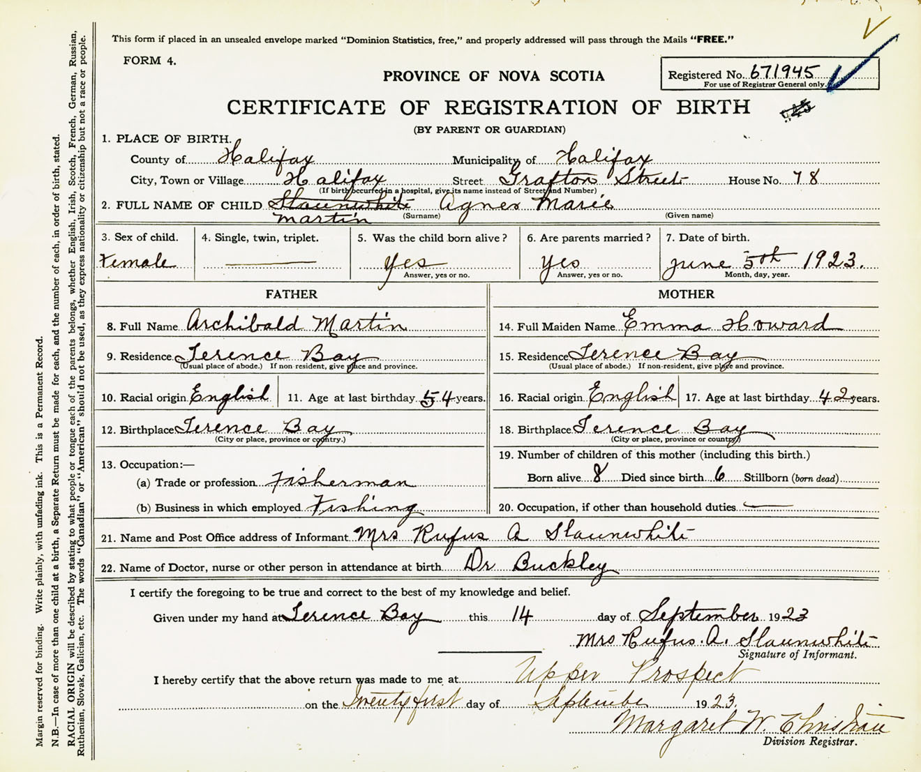 Female Birth Registration: Year: 1923 number: 67100945