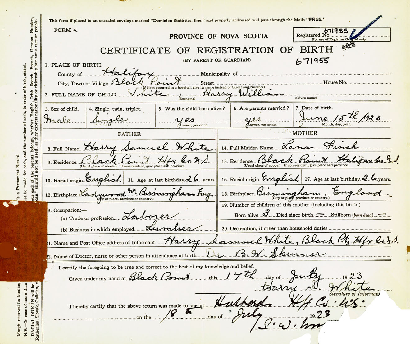 Male Birth Registration: Year: 1923 number: 67100955