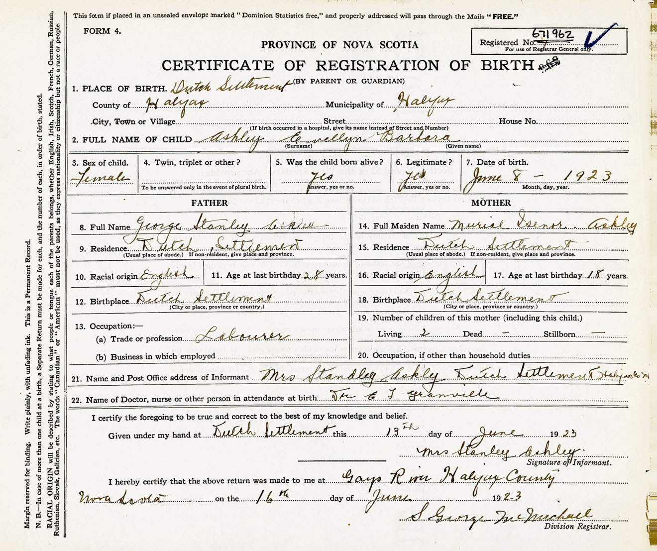 Female Birth Registration: Year: 1923 number: 67100962