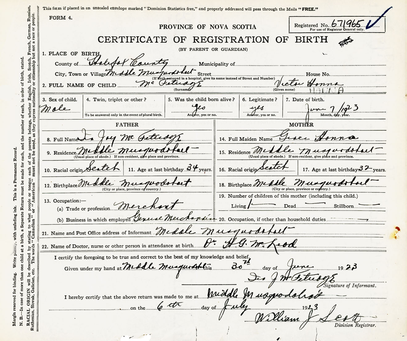 Male Birth Registration: Year: 1923 number: 67100965