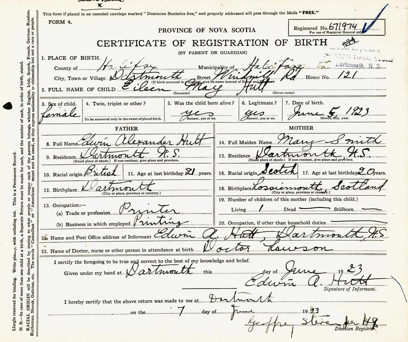 Female Birth Registration: Year: 1923 number: 67100974