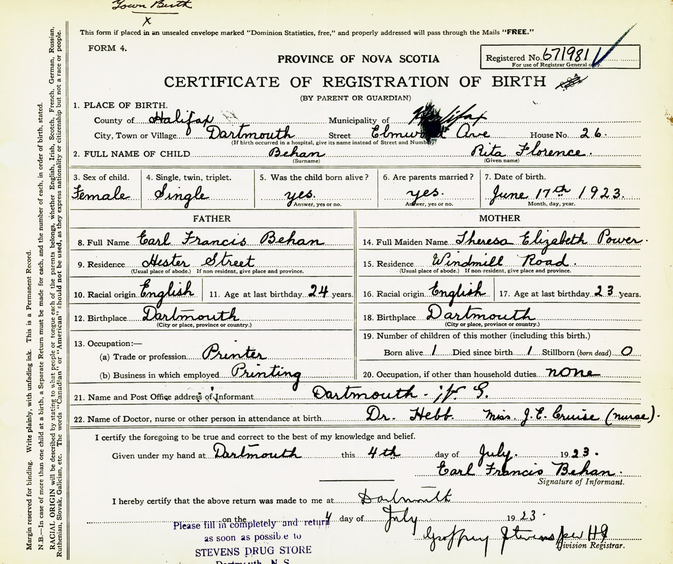 Female Birth Registration: Year: 1923 number: 67100981