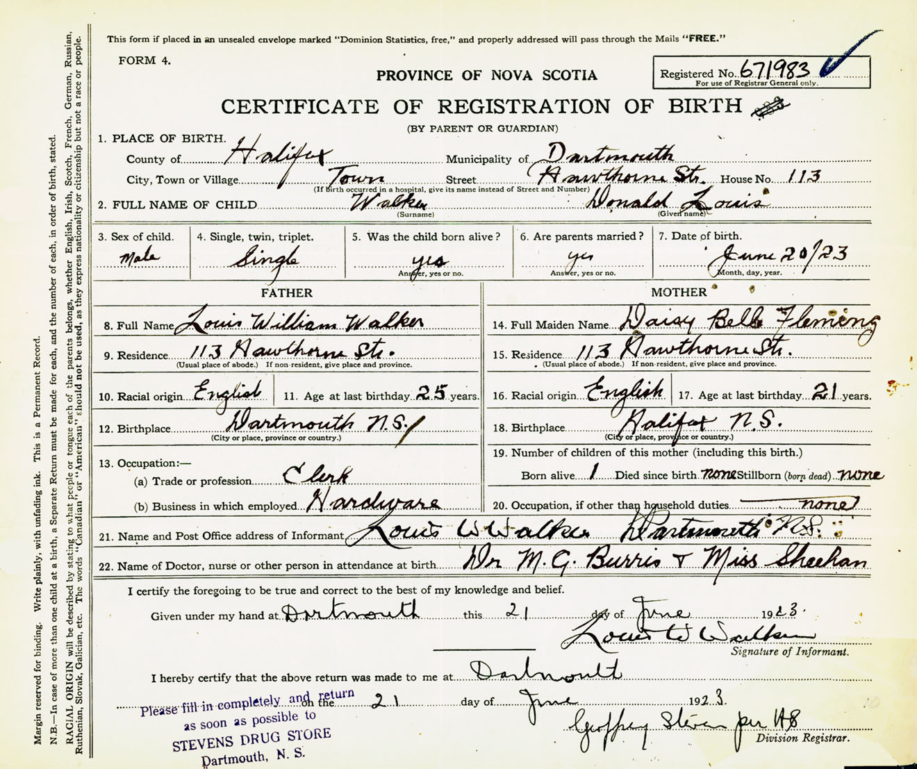 Male Birth Registration: Year: 1923 number: 67100983
