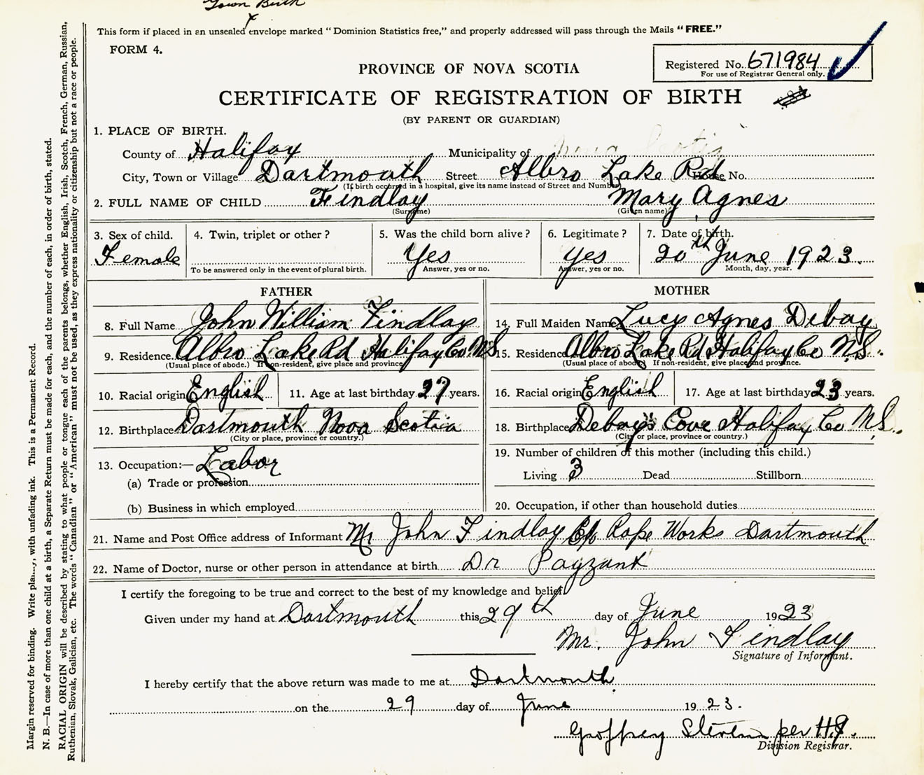 Female Birth Registration: Year: 1923 number: 67100984
