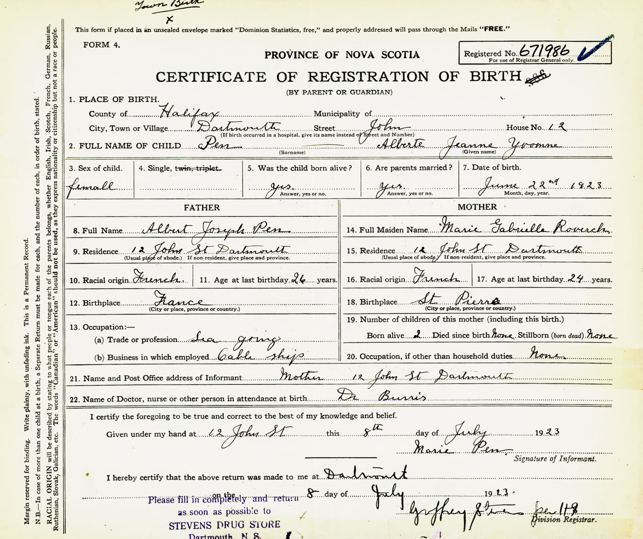 Female Birth Registration: Year: 1923 number: 67100986