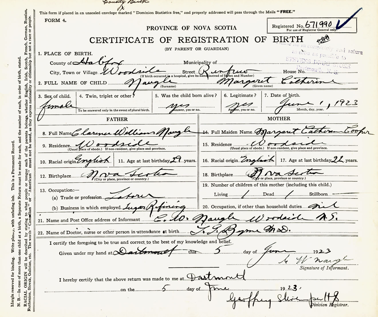 Female Birth Registration: Year: 1923 number: 67100990