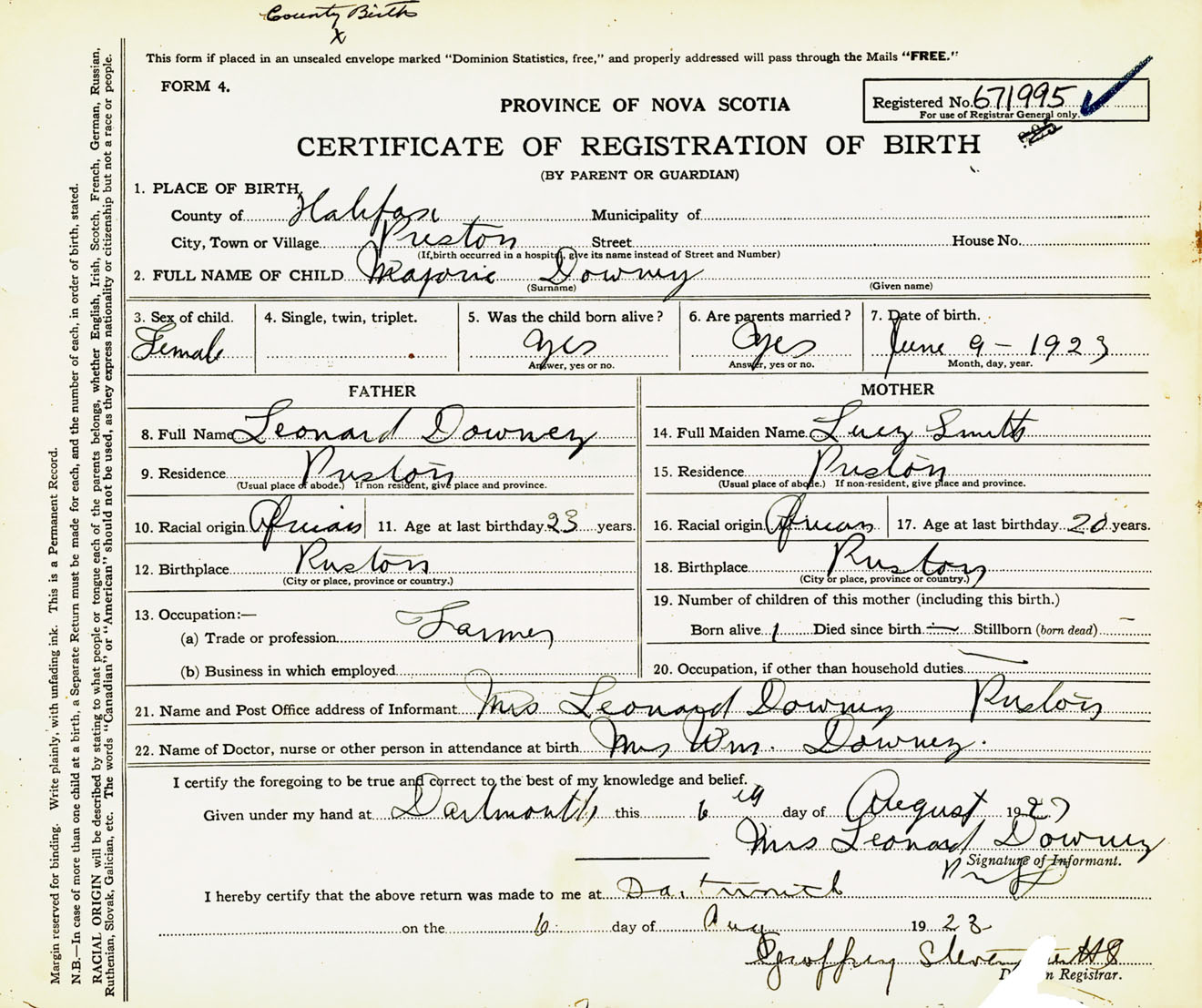 Female Birth Registration: Year: 1923 number: 67100995