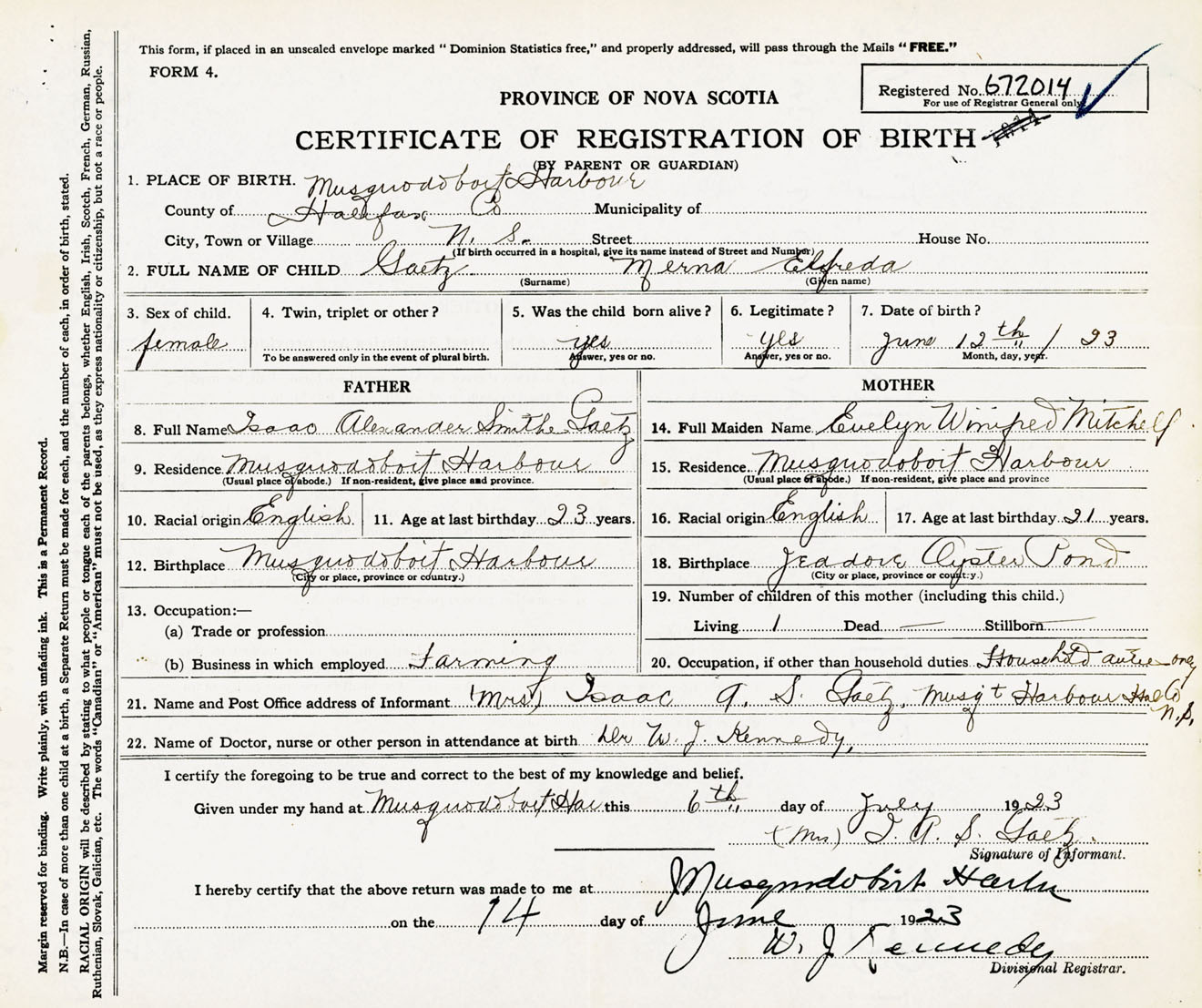 Female Birth Registration: Year: 1923 number: 67200014