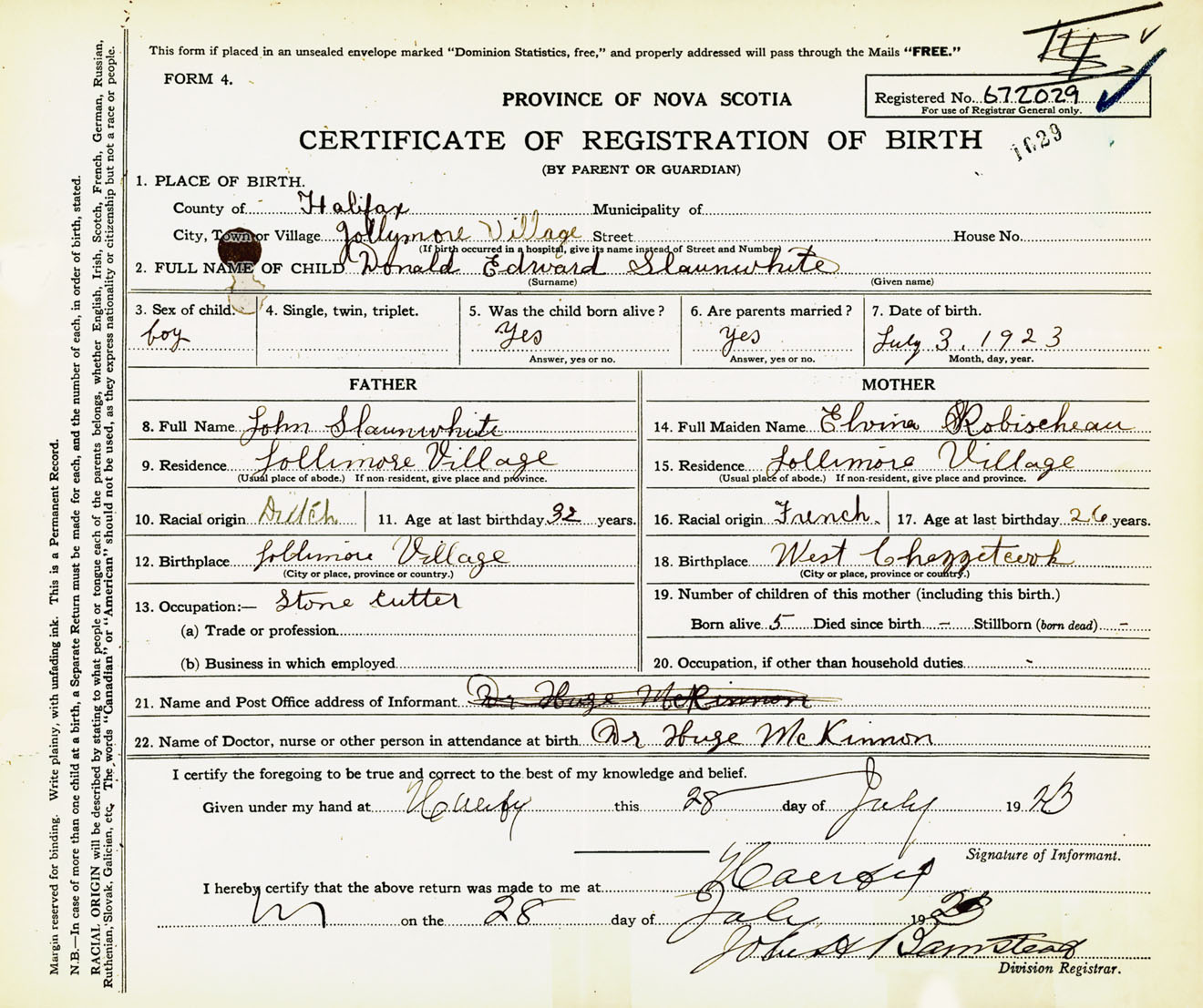 Male Birth Registration: Year: 1923 number: 67200029