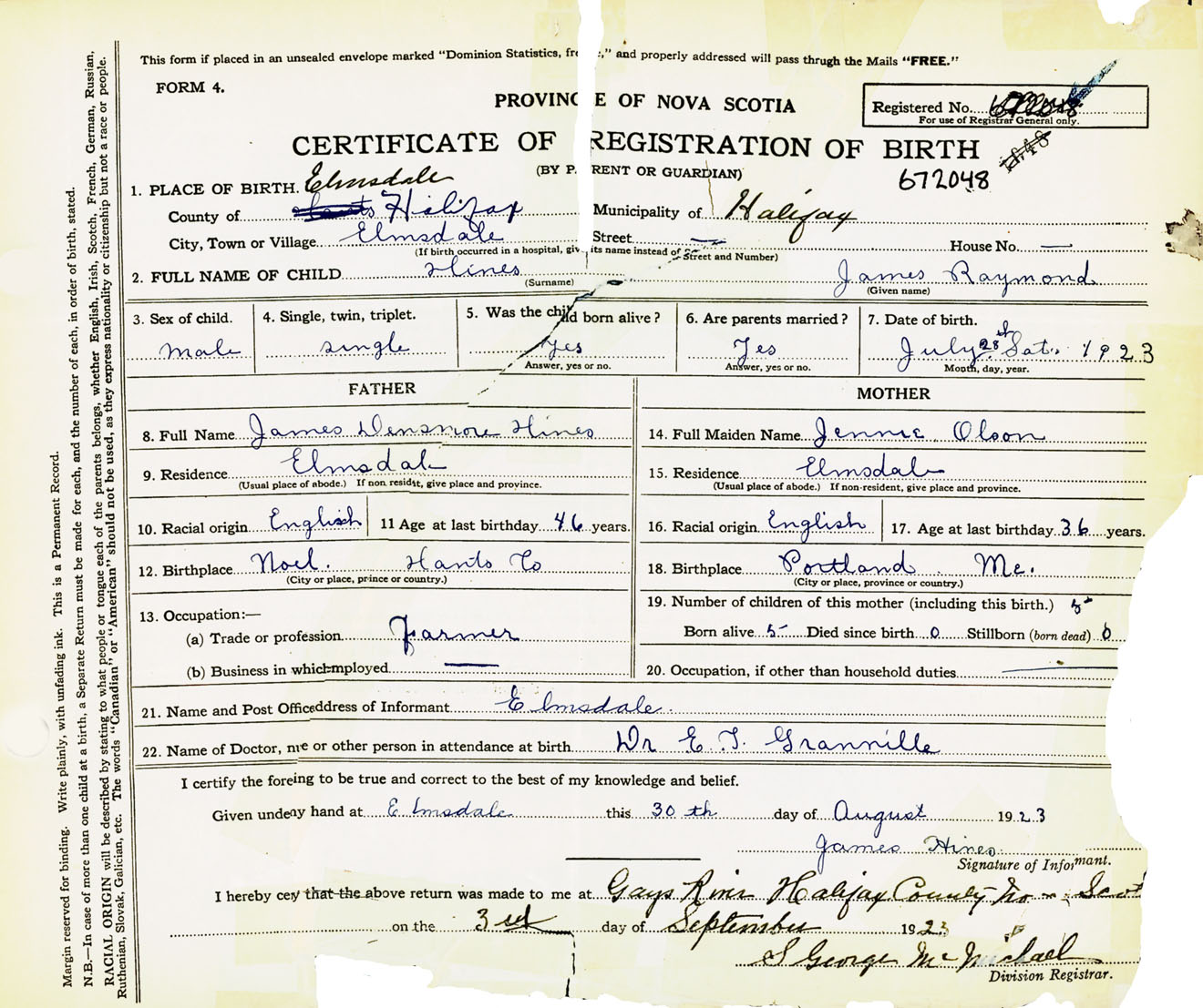 Male Birth Registration: Year: 1923 number: 67200048