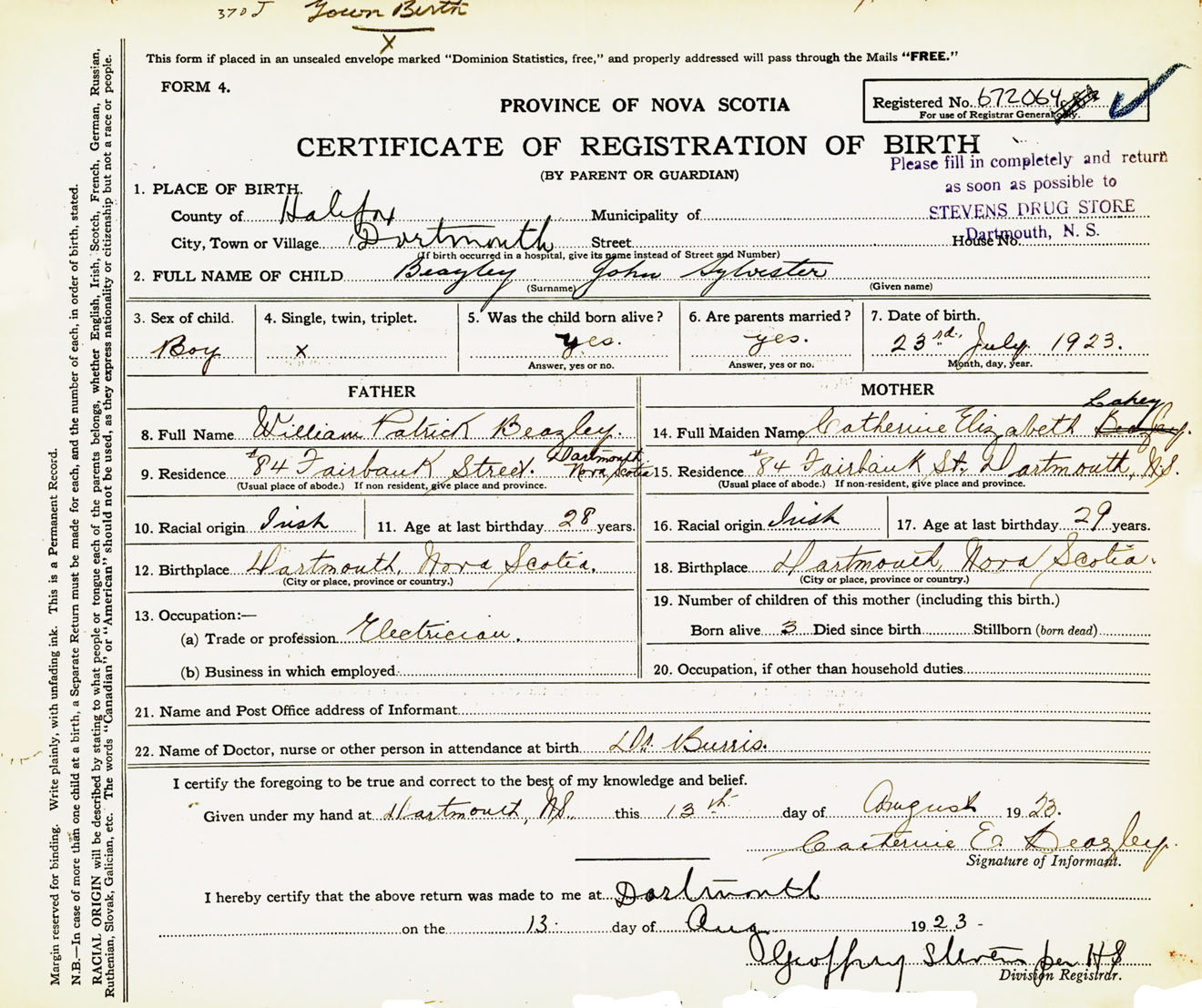 Male Birth Registration: Year: 1923 number: 67200064