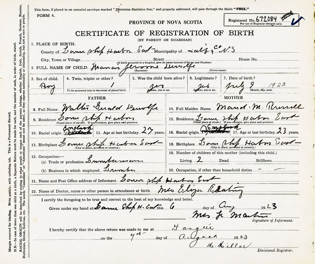 Male Birth Registration: Year: 1923 number: 67200084