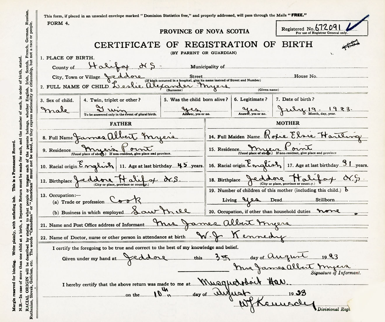 Male Birth Registration: Year: 1923 number: 67200091