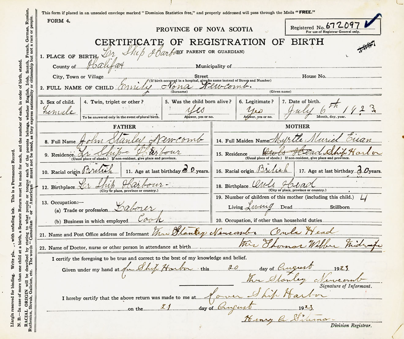 Female Birth Registration: Year: 1923 number: 67200097