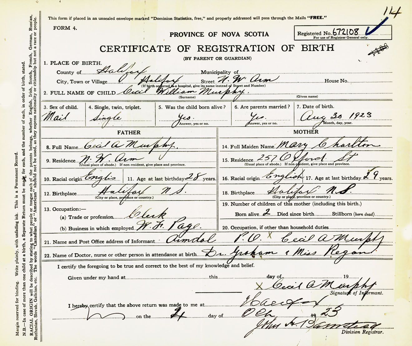 Male Birth Registration: Year: 1923 number: 67200108