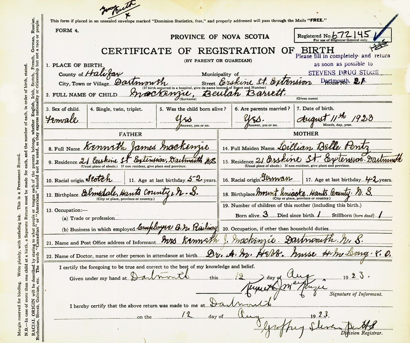 Female Birth Registration: Year: 1923 number: 67200145