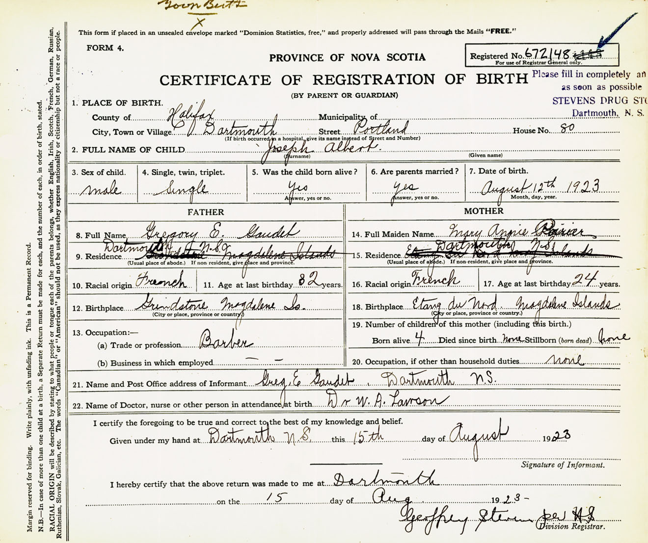 Male Birth Registration: Year: 1923 number: 67200148
