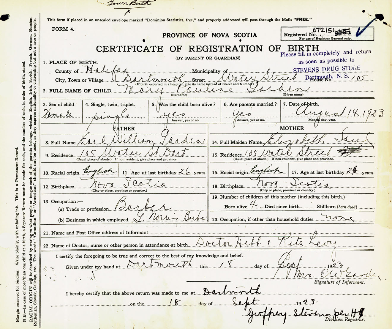 Female Birth Registration: Year: 1923 number: 67200151