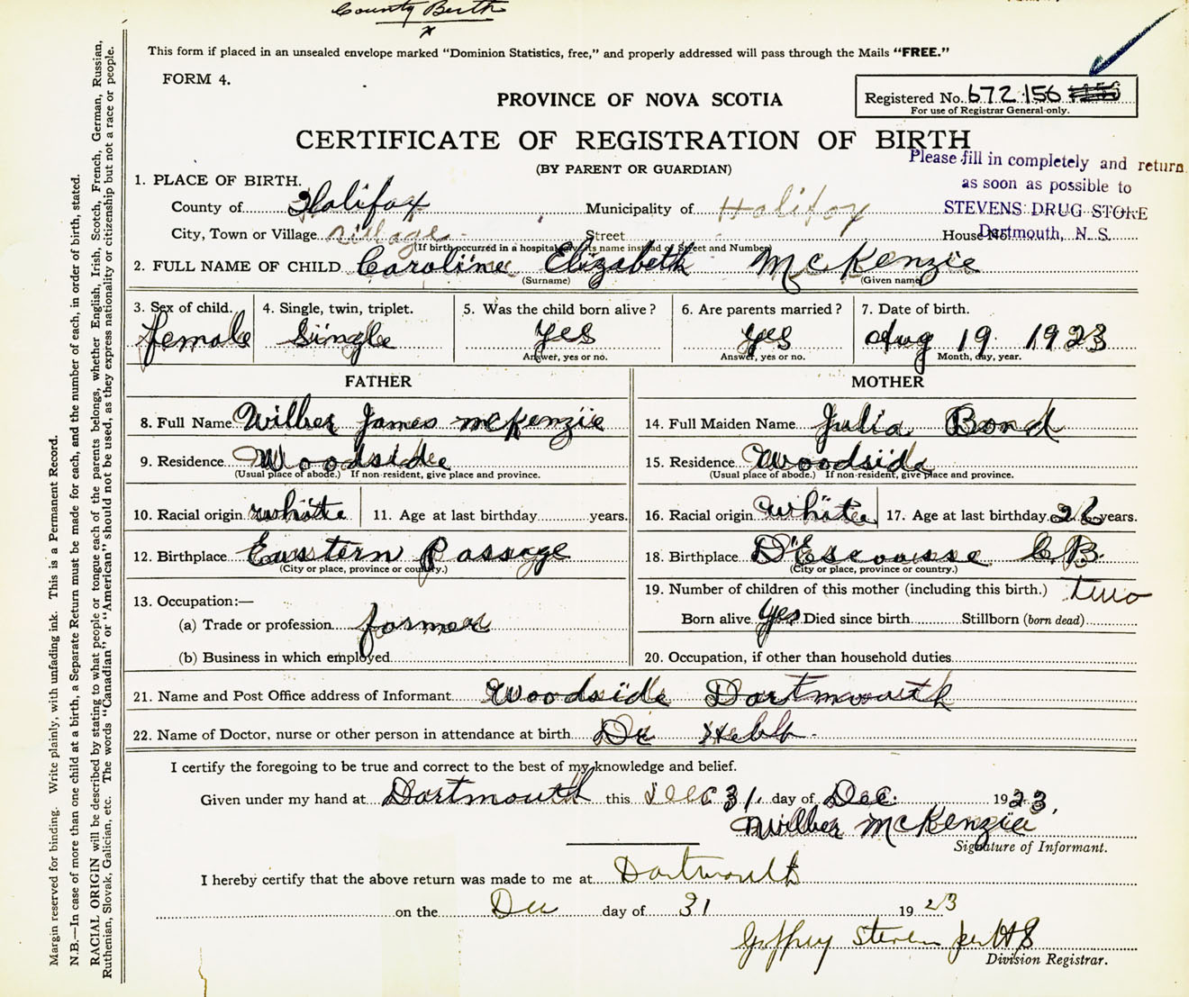 Female Birth Registration: Year: 1923 number: 67200156