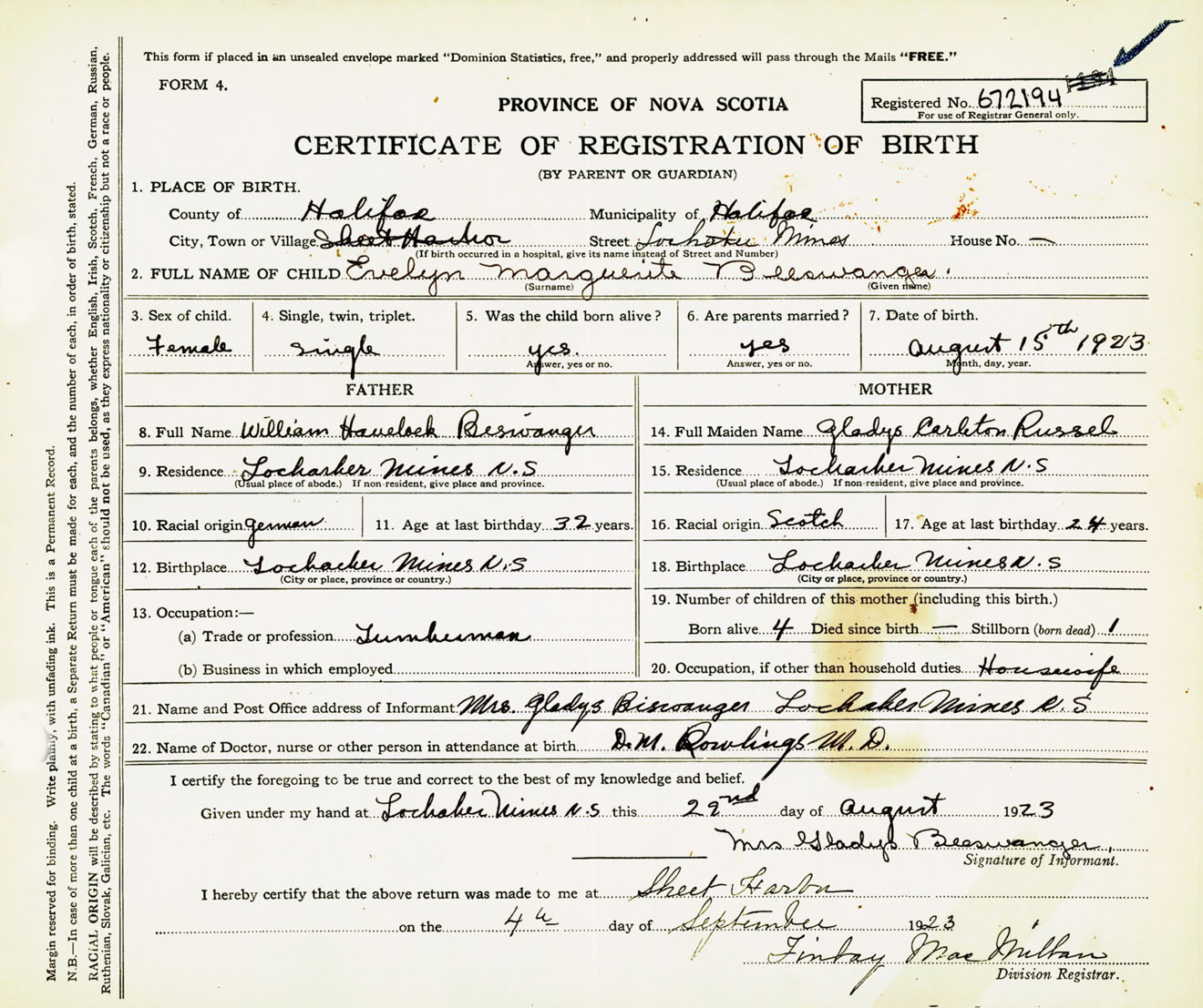 Female Birth Registration: Year: 1923 number: 67200194