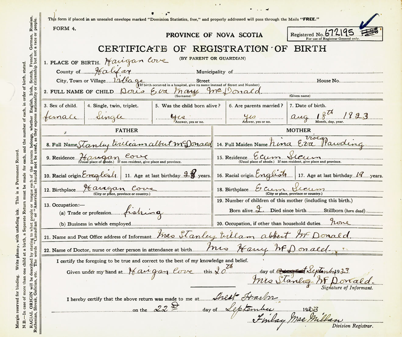 Female Birth Registration: Year: 1923 number: 67200195