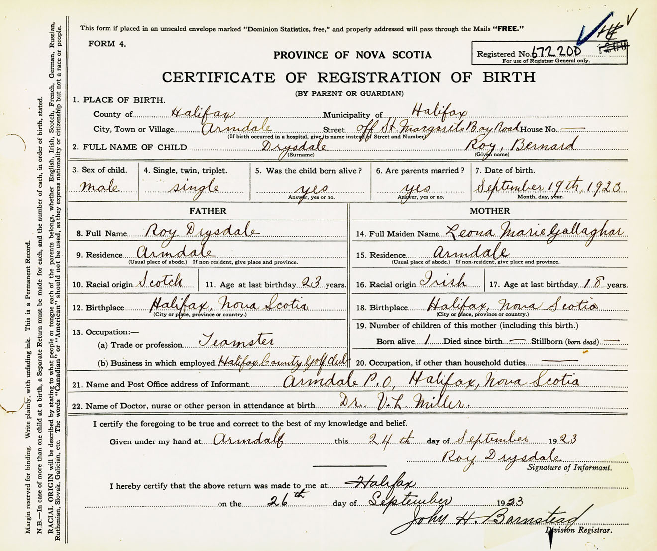 Male Birth Registration: Year: 1923 number: 67200200